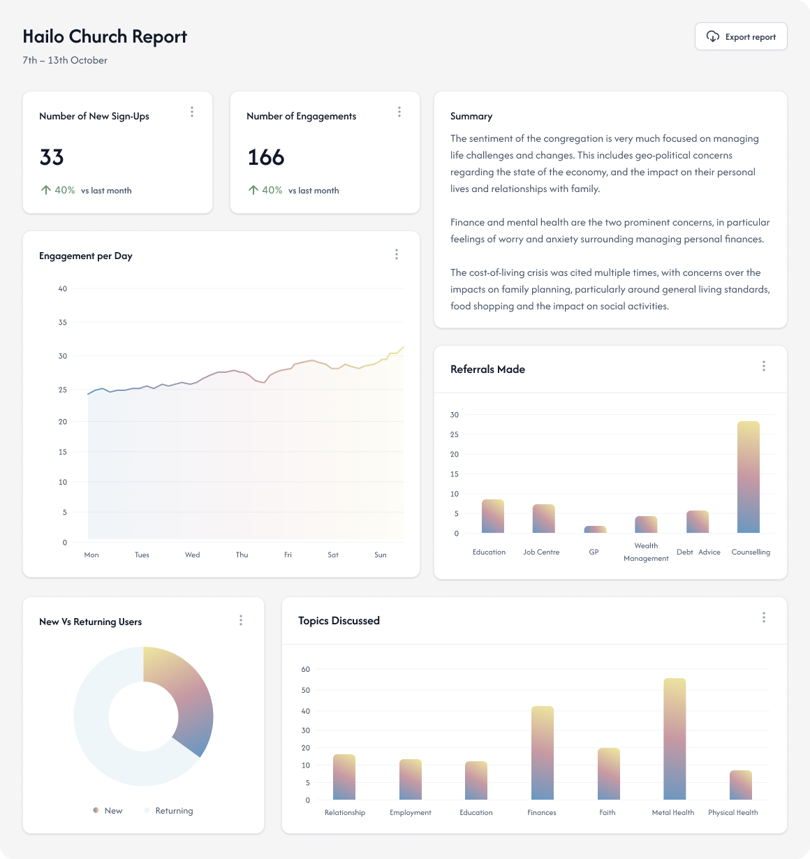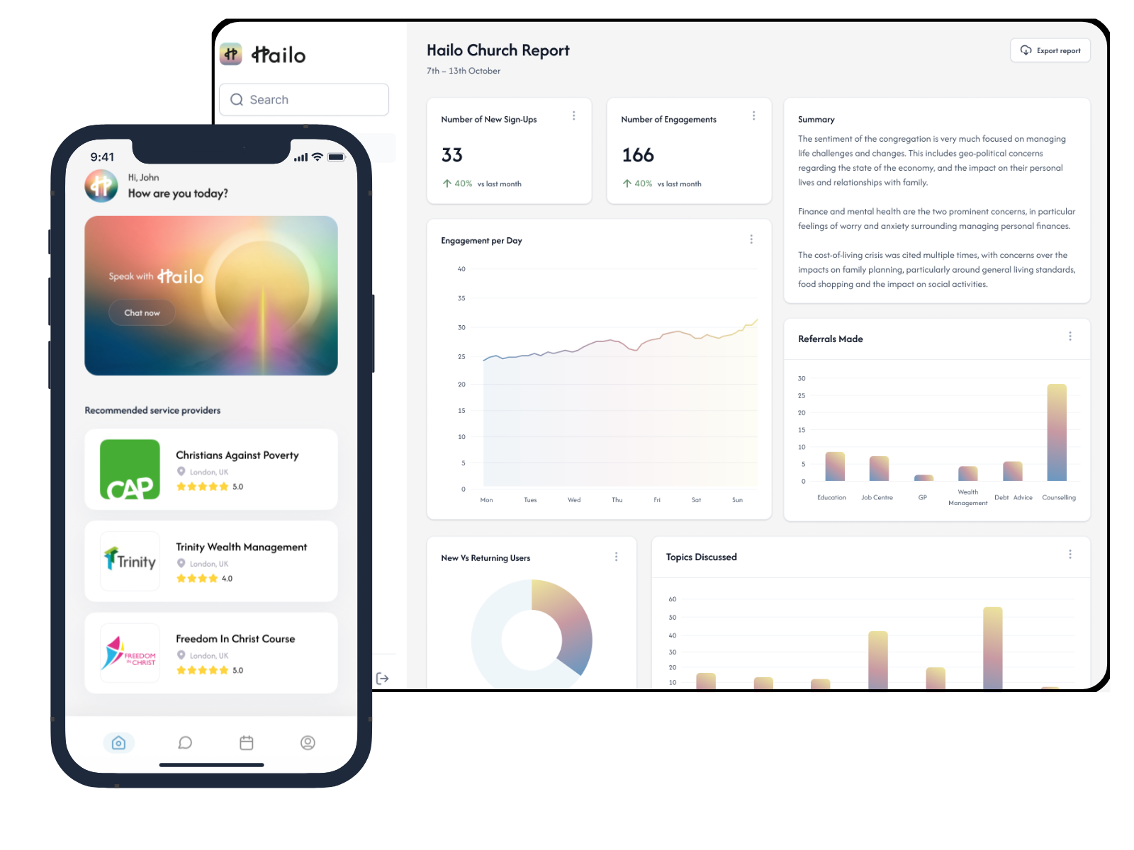 For church leaders, Hailo offers a data-driven approach to ministry. Our secure reports reveal anonymised insights into the challenges and concerns of your congregation, empowering you to shape sermons and outreach that resonate deeply with the needs of your community.